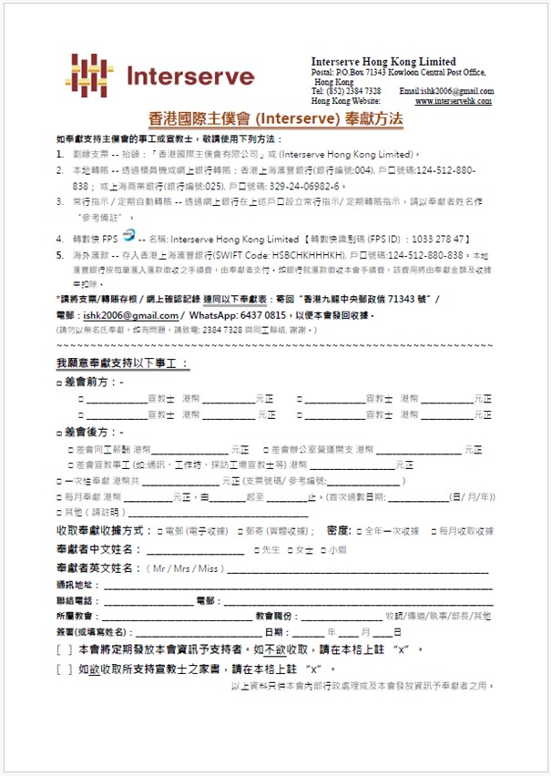 抬頭:「香港國際主僕會有限公司」或 (Interserve Hong Kong Limited) - 本地轉賬